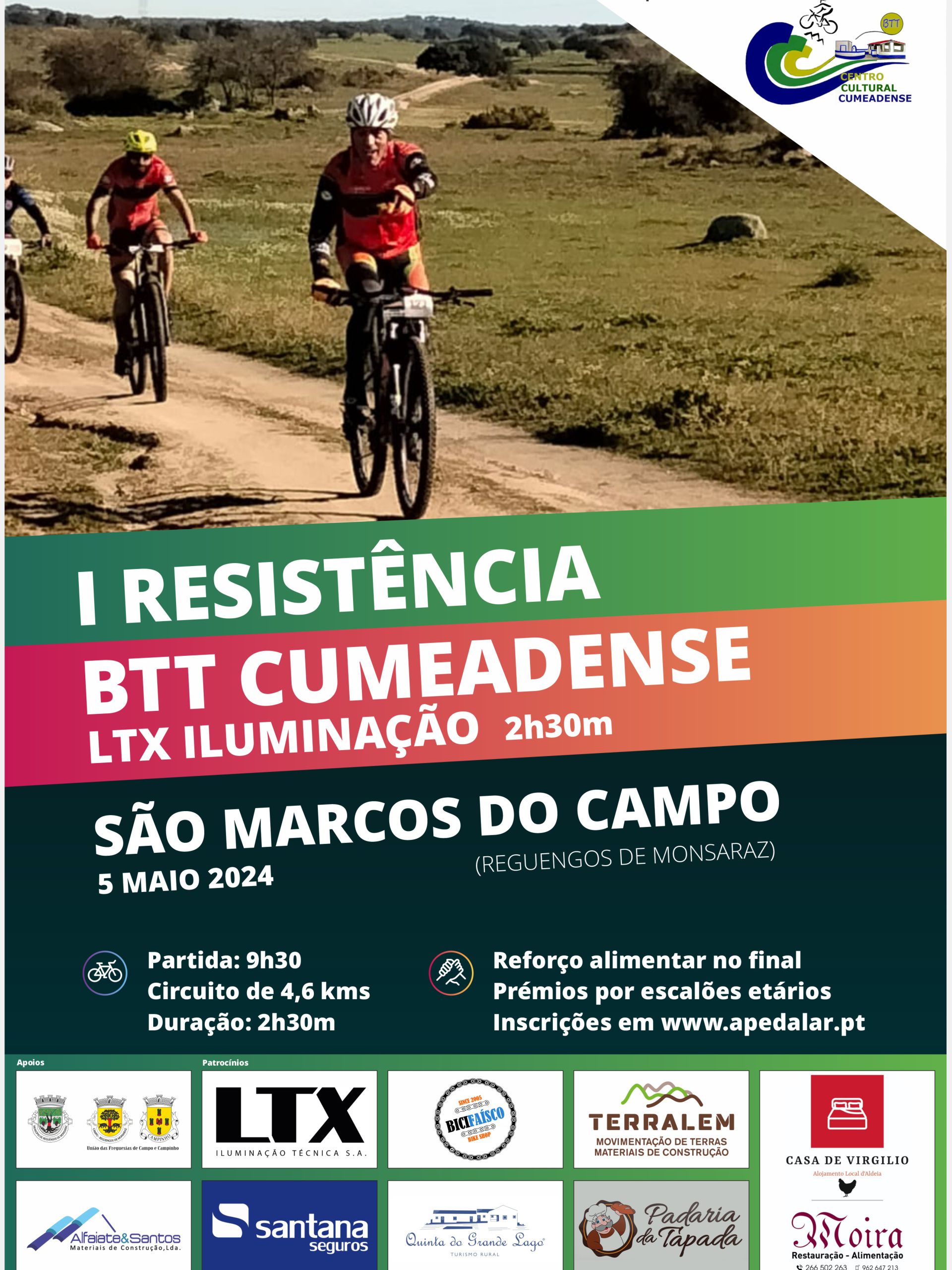 A 1ª Resistência BTT CUMEADENSE / LTX ILUMINAÇÃO é organizada pela secção de BTT do Centro Cultural Cumeadense, com o apoio da Câmara Municipal de Reguengos de Monsaraz e da União de Freguesias de Campo e Campinho.