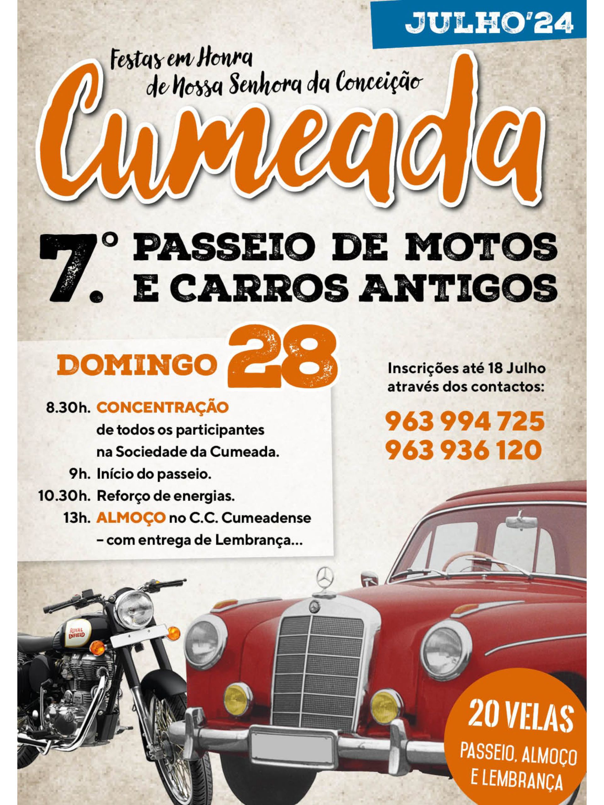 O 7º Passeio de Motos e Carros Antigos vai-se realizar no dia 28 de julho na Cumeada, por ocasião das Festas em honra da Nossa Senhora da Conceição.