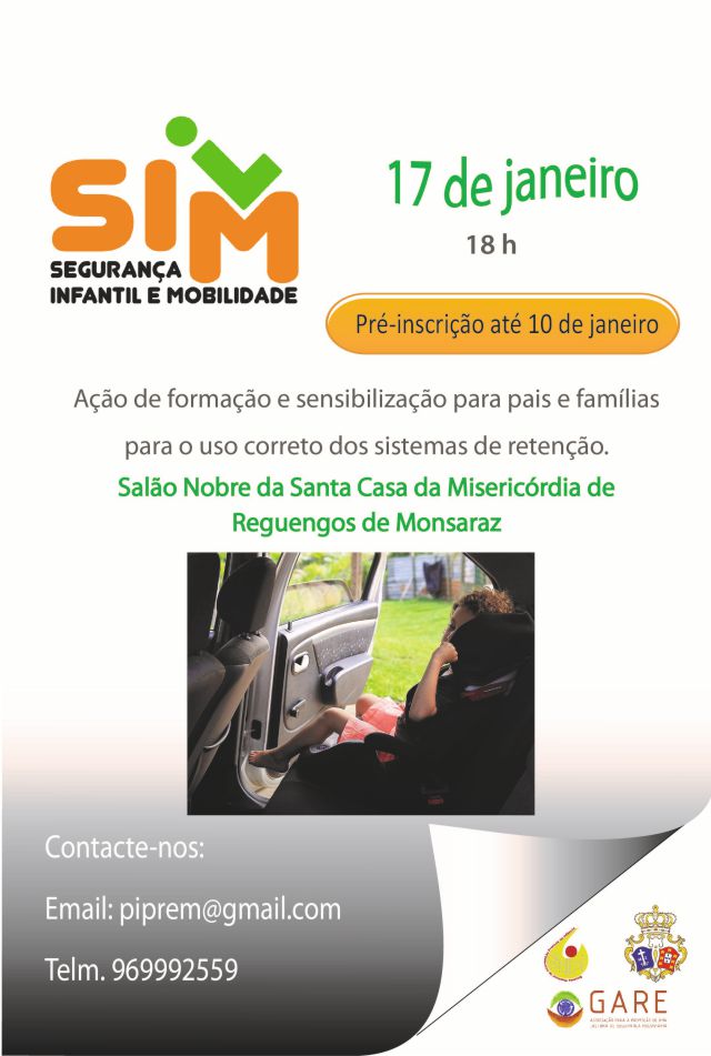 Ação de formação e sesibilização para pais e famílias para o usos correto dos sistemas de retenção no automóvel. dia 17 de janeiro, às 18h00 no Salão Nobre da Santa Casa da Misericórdia de Reguengos de Monsaraz