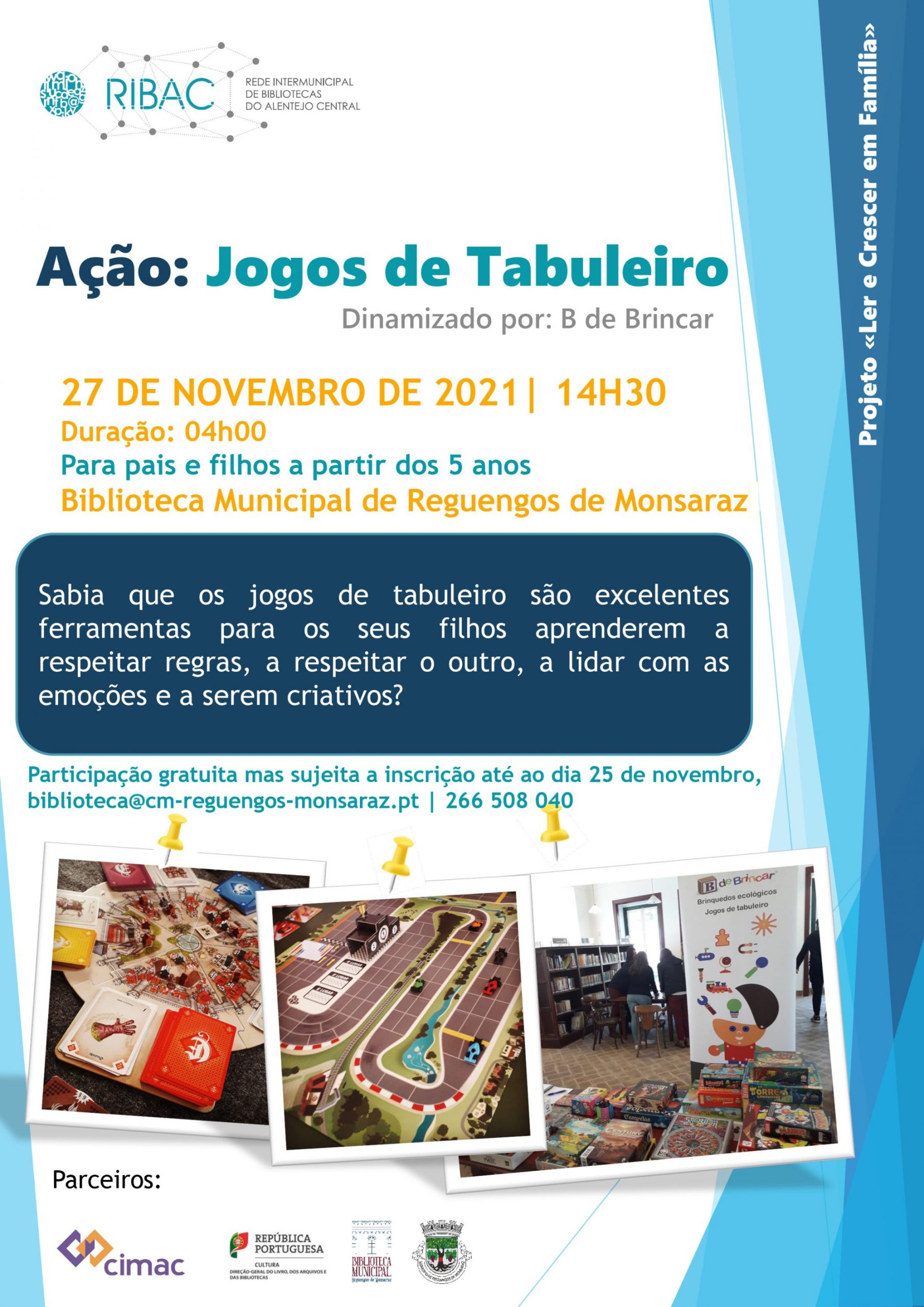 Esta é uma iniciativa do projeto “Ler e Crescer em Família” da RIBAC – Rede Intermunicipal de Bibliotecas do Alentejo central, em parceria com a CIMAC, a Direção-Geral do Livro, dos Arquivos e das bibliotecas, o Município de Reguengos de Monsaraz e a Biblioteca Municipal de Reguengos de Monsaraz