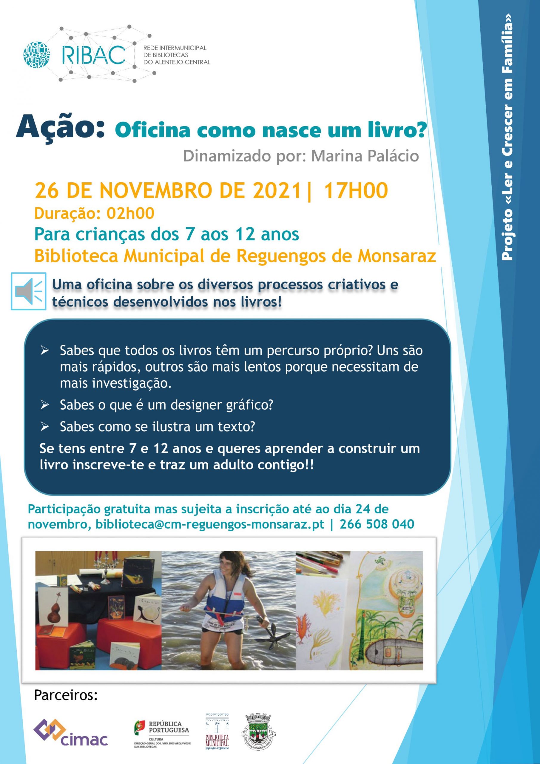 Esta é uma iniciativa do projeto “Ler e Crescer em Família” da RIBAC – Rede Intermunicipal de Bibliotecas do Alentejo central, em parceria com a CIMAC, a Direção-Geral do Livro, dos Arquivos e das bibliotecas, o Município de Reguengos de Monsaraz e a Biblioteca Municipal de Reguengos de Monsaraz