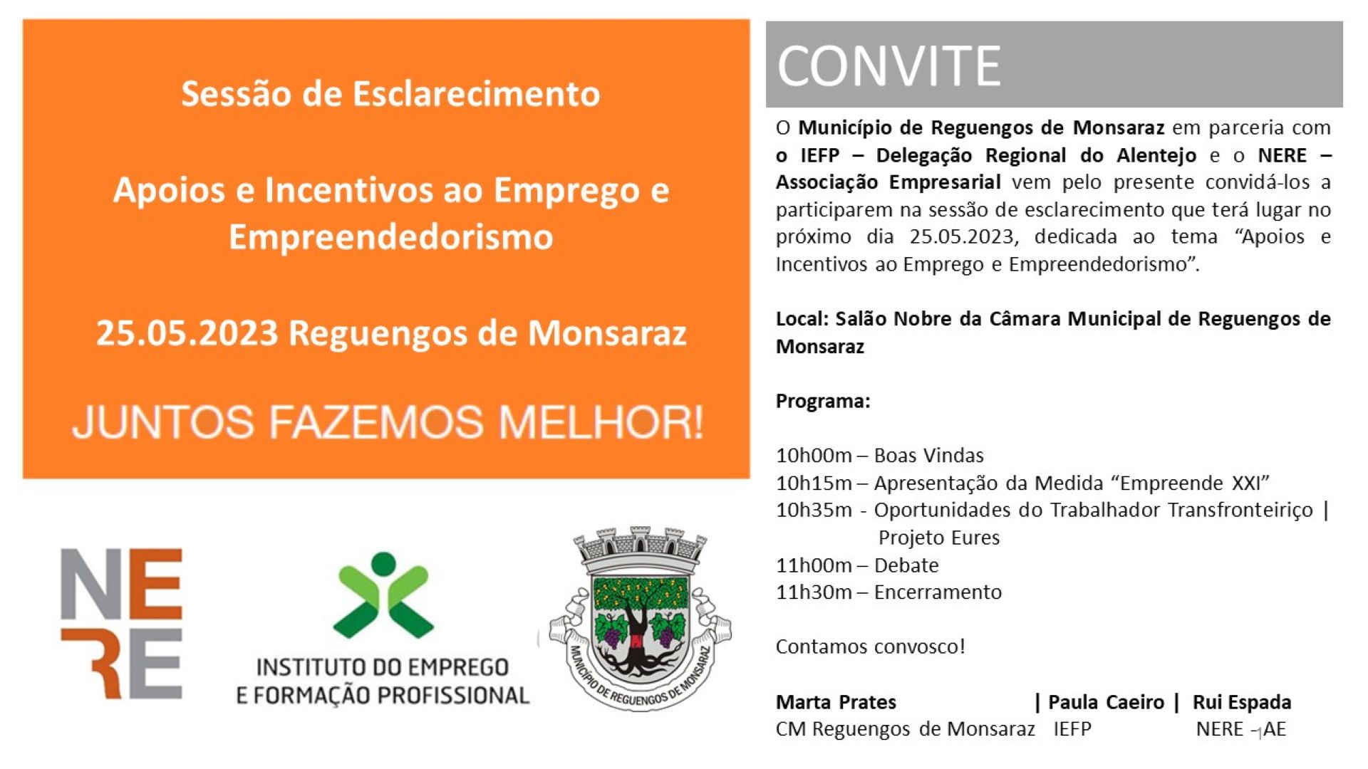 O Município de Reguengos de Monsaraz em parceria com o IEFP – Delegação Regional do Alentejo e o NERE – Associação Empresarial vem pelo presente convidá-los a participarem na sessão de esclarecimento que terá lugar no próximo dia 25.05.2023, dedicada ao tema “Apoios e Incentivos ao Emprego e Empreendedorismo”.