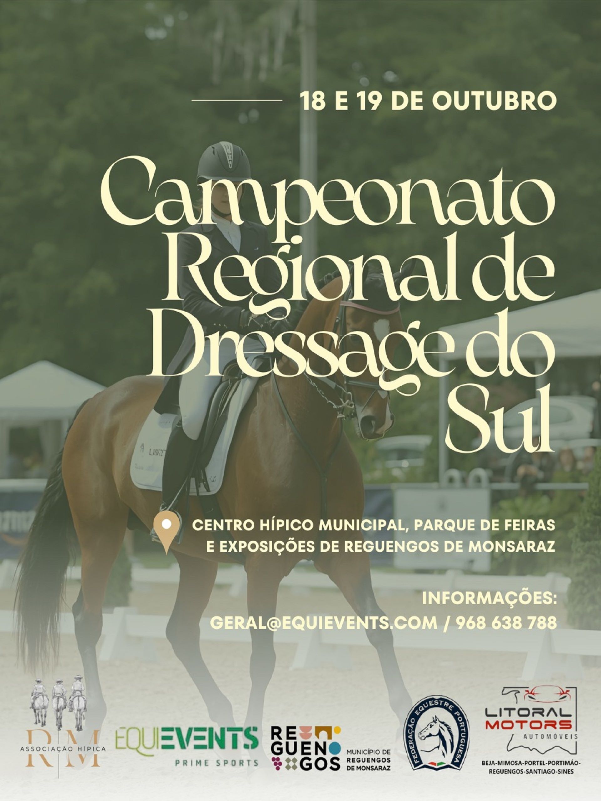 Nos dias 18 e 19 de outubro, o Centro Hípico Municipal, situado no Parque de Feiras e Exposições de Reguengos de Monsaraz, será palco do Campeonato Regional de Dressage do Sul. O evento, organizado pela Associação Hípica de Reguengos de Monsaraz e pela Equievents Prime Sports, com o apoio do Município de Reguengos de Monsaraz e da Litoral Motors, promete reunir os melhores cavaleiros da região numa competição de elevado nível técnico e elegância.