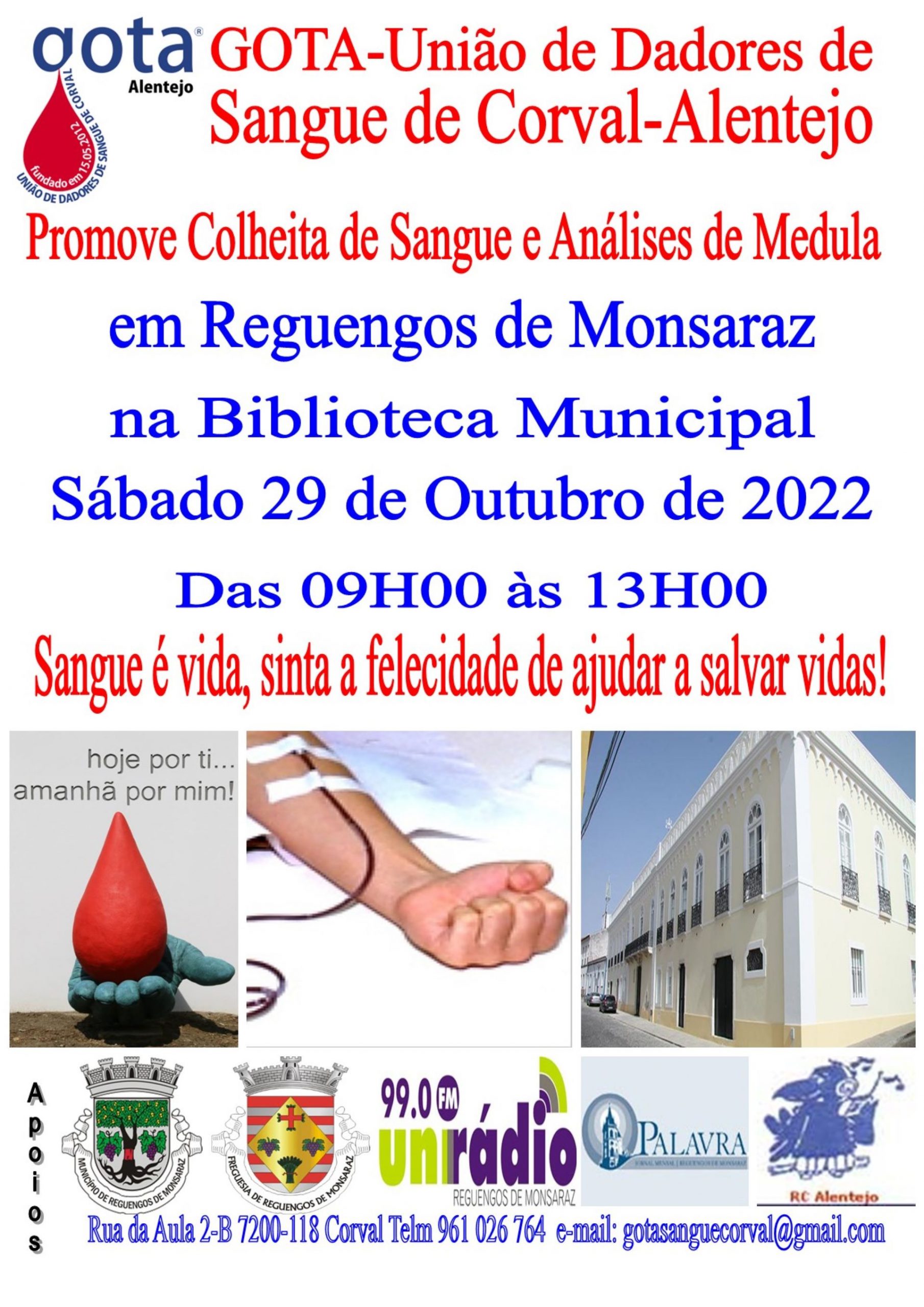 A associação GOTA – União de Dadores de Sangue de Corval-Alentejo promove uma ação de colheita de sangue na Biblioteca Municipal, dia 29 de outubro de 2022, das 09h00 às 13h00.