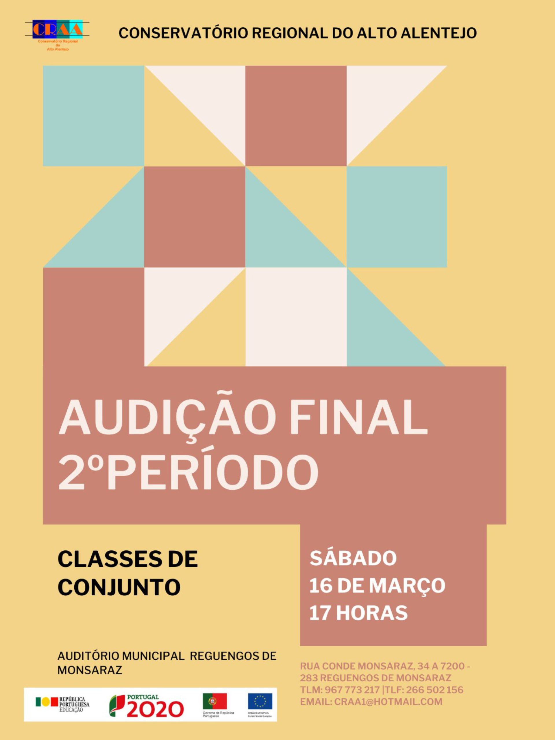 No dia 16 de março, pelas 17 horas no Auditório Municipal de Reguengos de Monsaraz, o Conservatório Regional do Alto Alentejo vai apresentar o concerto de Audição Final do 2.º Período das Classes de Conjunto.