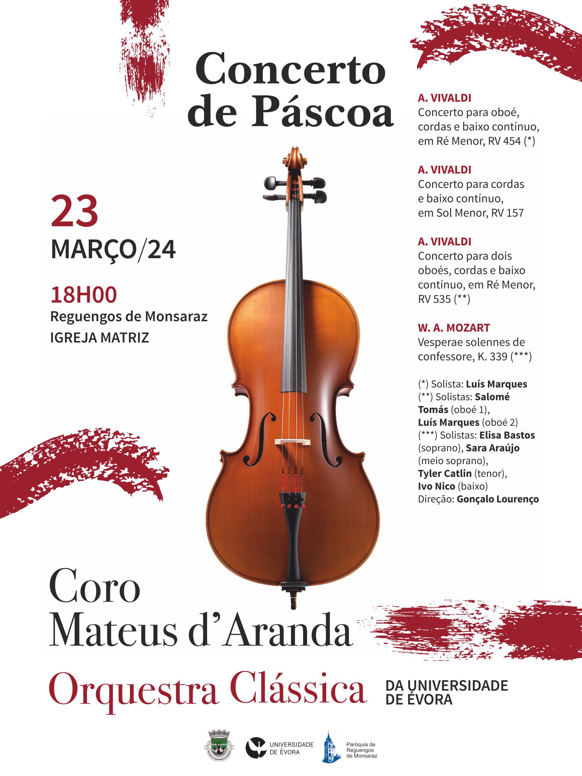 No dia 23 de março o Coro Mateus d’Aranda e a Orquestra Clássica da Universidade de Évora vão apresentar o Concerto de Páscoa na Igreja Matriz de Reguengos de Monsaraz, pelas 18h00.