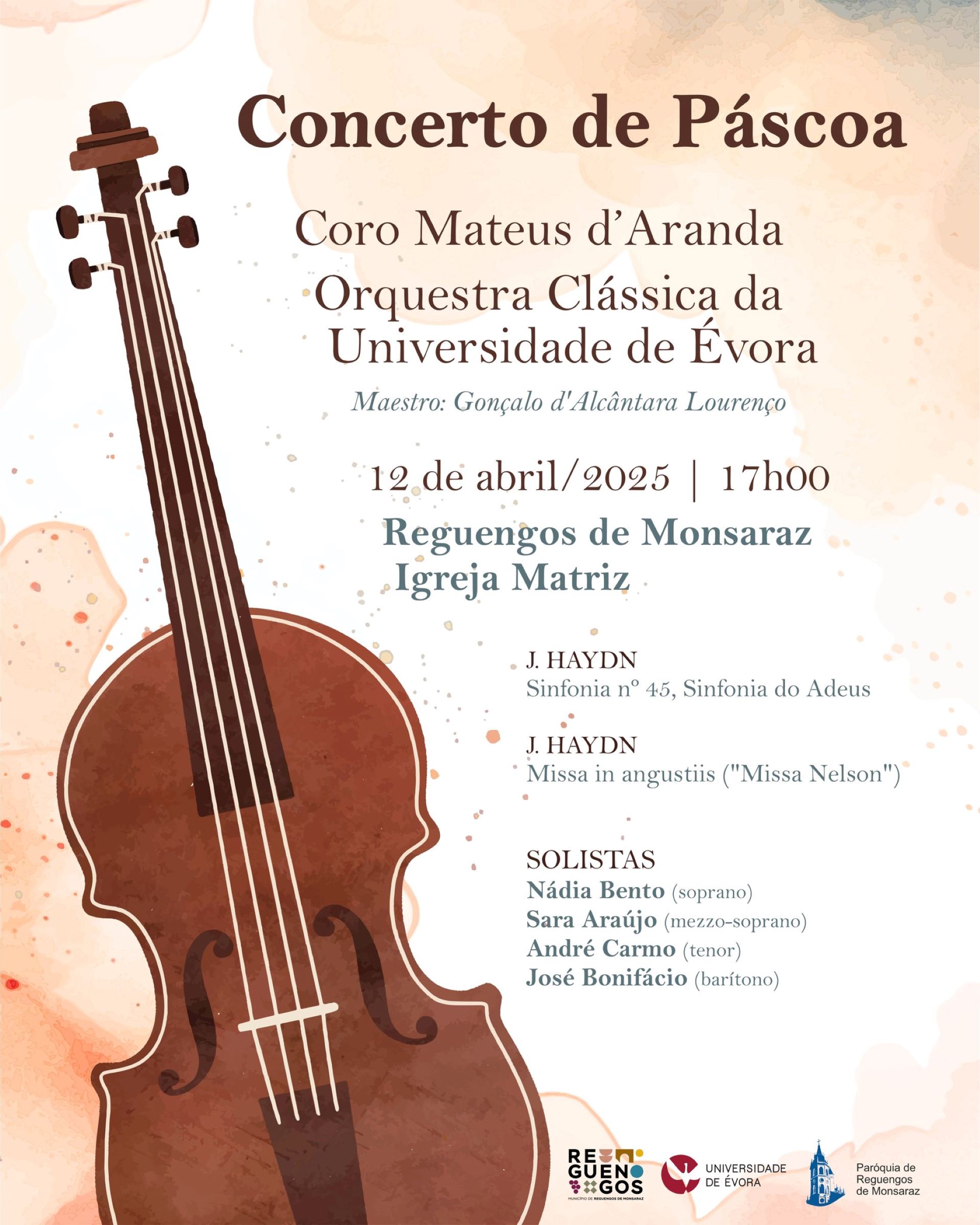 No dia 12 de abril de 2025, às 17h00, a Igreja Matriz de Reguengos de Monsaraz acolhe o Concerto de Páscoa, interpretado pelo Coro Mateus d’Aranda e pela Orquestra Clássica da Universidade de Évora, sob a direção do maestro Gonçalo d’Alcântara Lourenço.