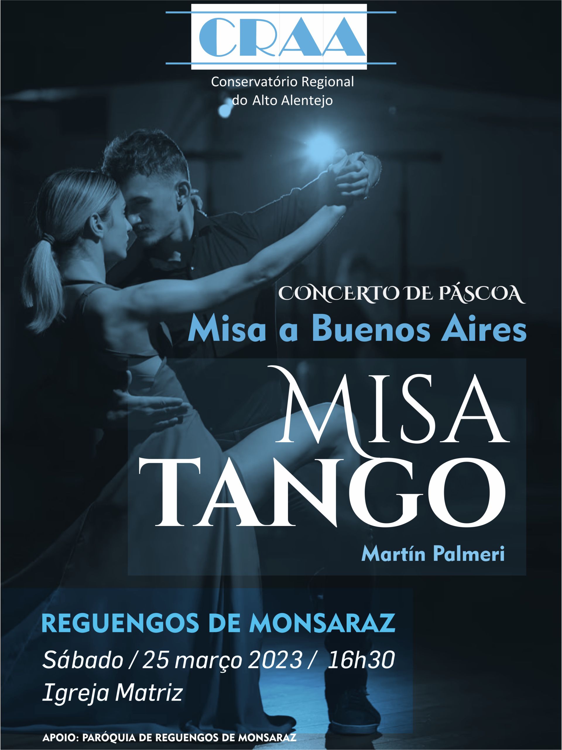 No dia 25 de março, pelas 16h30, os alunos e professores do Conservatório Regional do Alto Alentejo em parceria com o Coro Polifónico da Sociedade Filarmónica Harmonia Reguenguense e com o apoio da Paróquia de Reguengos de Monsaraz, vão apresentar em concerto “Misa a Buenos Aires” de Martín Palmieri, sob direção do Maestro João Defesa na Igreja Matriz de Santo António em Reguengos de Monsaraz. O evento é de entrada livre.
