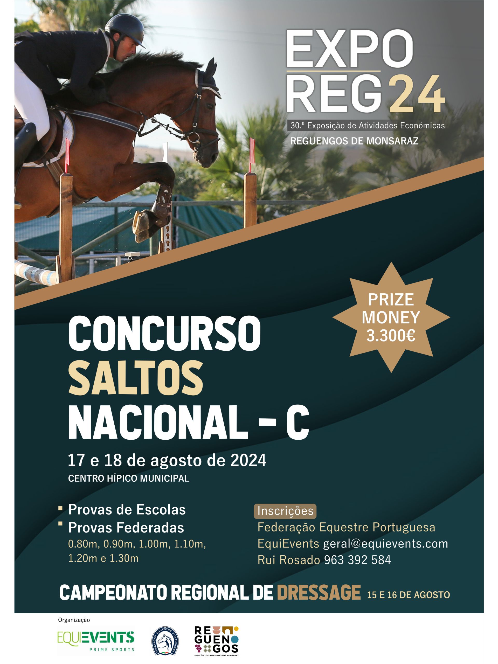 Nos dias 17 e 18 de agosto de 2024, o Centro Hípico Municipal de Reguengos de Monsaraz será palco do Concurso de Saltos Nacional-C, durante o evento EXPOREG 24. A competição promete momentos de alta adrenalina para os amantes do desporto equestre, com provas em diversas categorias, desde escolas até federadas, e obstáculos que variam entre 0,80m e 1,30m. O evento contará com um prize money total de 3.300€.