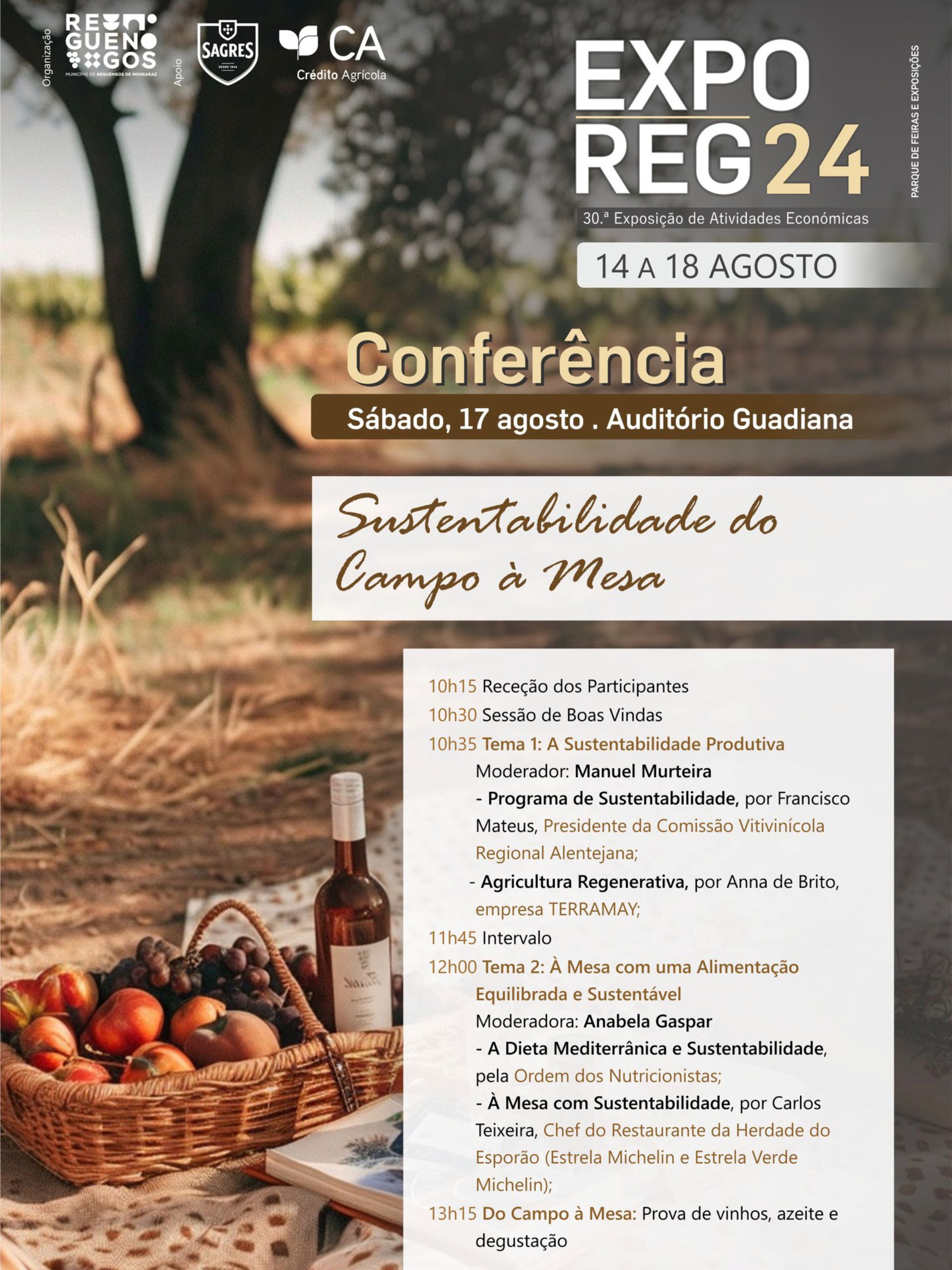A 30ª Exposição de Atividades Económicas, EXPOREG 24, acontecerá de 14 a 18 de agosto, e contará com uma conferência de destaque no dia 17 de agosto, no Auditório Guadiana. O evento, intitulado “Sustentabilidade do Campo à Mesa”, terá início às 10h15 com a receção dos participantes, seguida de uma sessão de boas-vindas às 10h30.