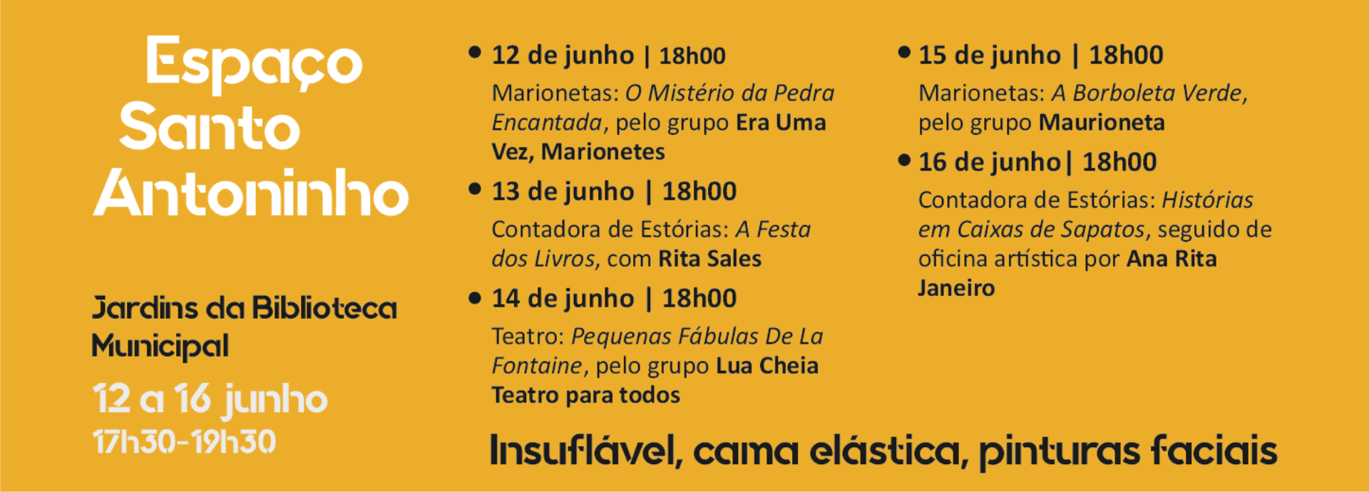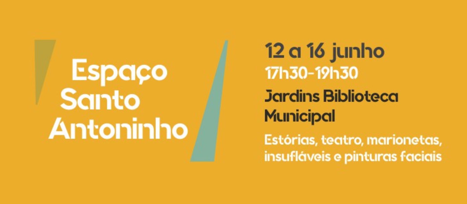 A pensar nos momentos em família, e em especial nos mais pequenos, o Espaço Santo Antoninho, vai decorrer durante as Festas de Santo António nos Jardins da Biblioteca Municipal e oferece uma programação especial com contadores de estórias, marionetas, teatro, insufláveis, cama elástica e pinturas faciais.