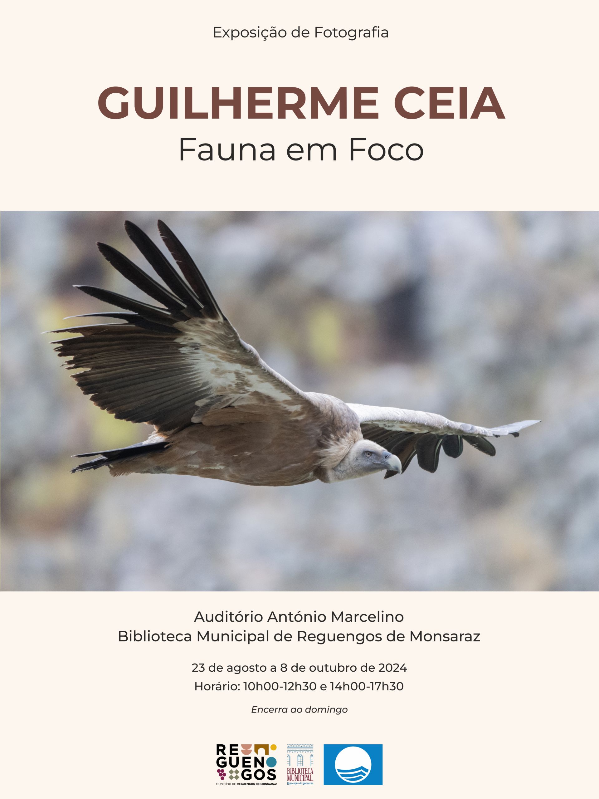 De 23 de agosto a 8 de outubro de 2024 estará patente no Auditório António Marcelino da Biblioteca Municipal de Reguengos de Monsaraz a exposição de fotografia da natureza “Fauna em Foco” da autoria de Guilherme Ceia.