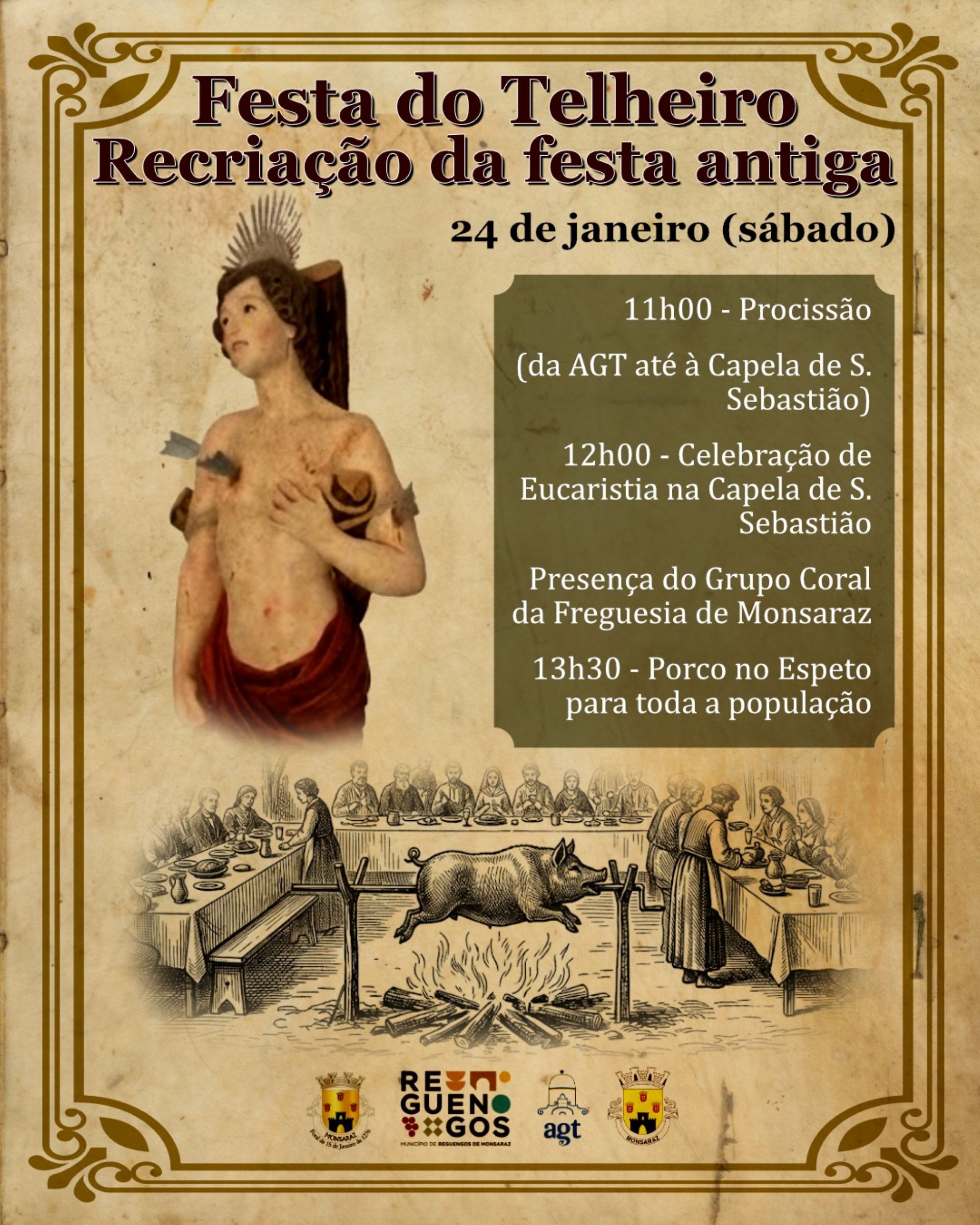 O programa inclui procissão às 11h00 desde a AGT até à Capela de São Sebastião, seguida de celebração de Eucaristia às 12h00, com a presença do Grupo Coral da Freguesia de Monsaraz.