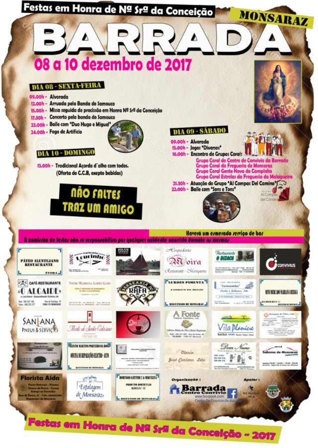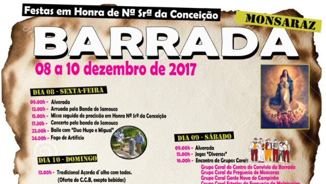 Tradicionais Festas em Honra de Nossa Senhora da Conceição com missa, procissão, bailes, grupos corais e a tradicional “Açorda d’alho com todos”. De 8 a 19 de dezembro na Barrada, organizado pelo Centro de Convívio da Barrada.