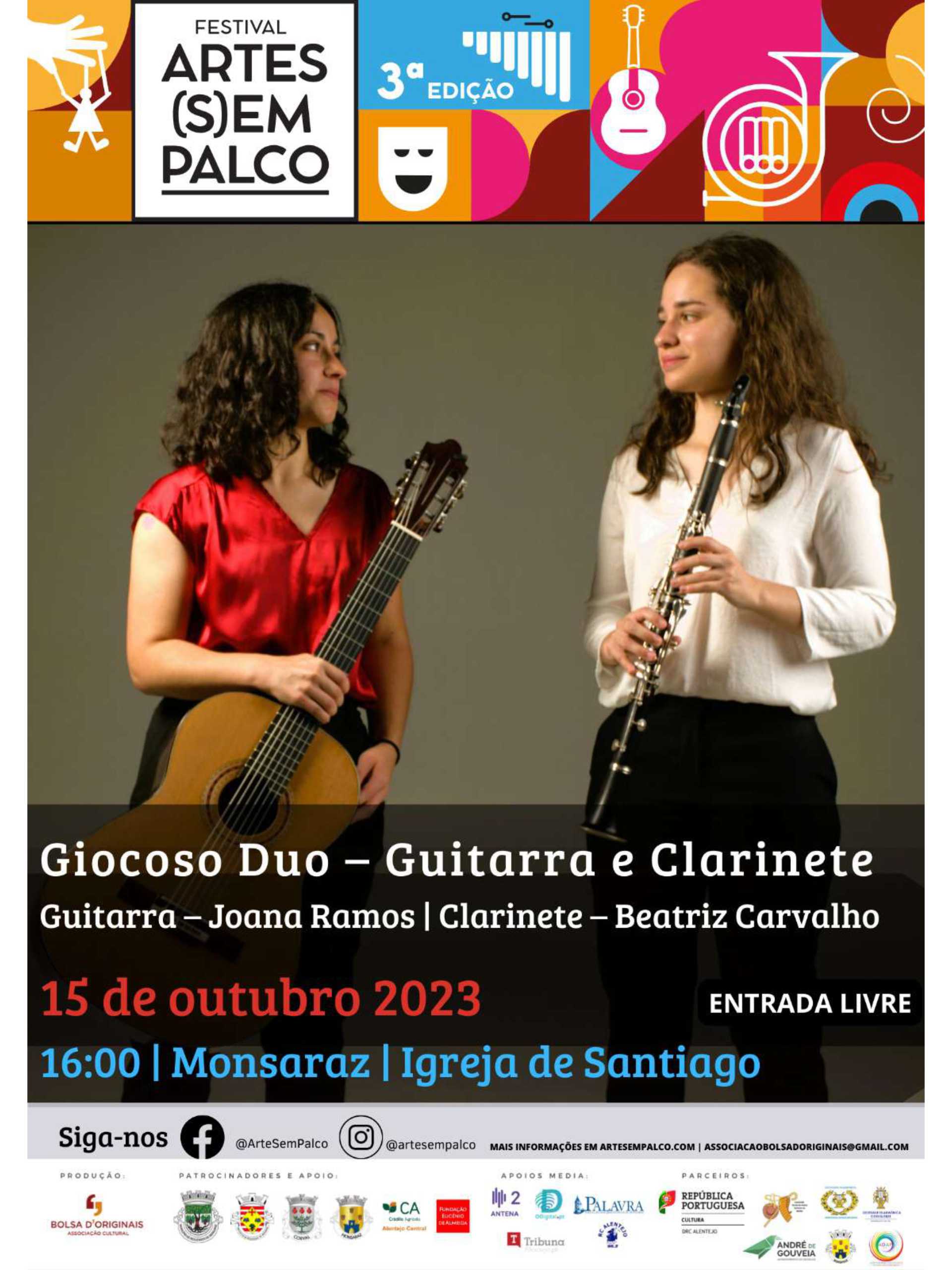 O Festival Arte(s)em Palco vai apresentar Giocoso Duo – Guitarra e Clarinete no dia 15 de outubro pelas 16h00 na Igreja de Santiago em Monsaraz.