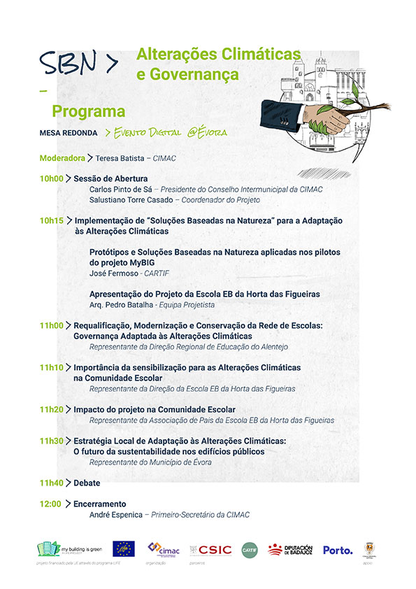 Esta iniciativa surge no âmbito do projeto My Building Is Green, do qual a CIMAC é parceira, e tem como objetivo aumentar a consciência, sensibilização e conhecimento das Soluções Baseadas na Natureza como medidas de adaptação climática em edifícios e cidades.