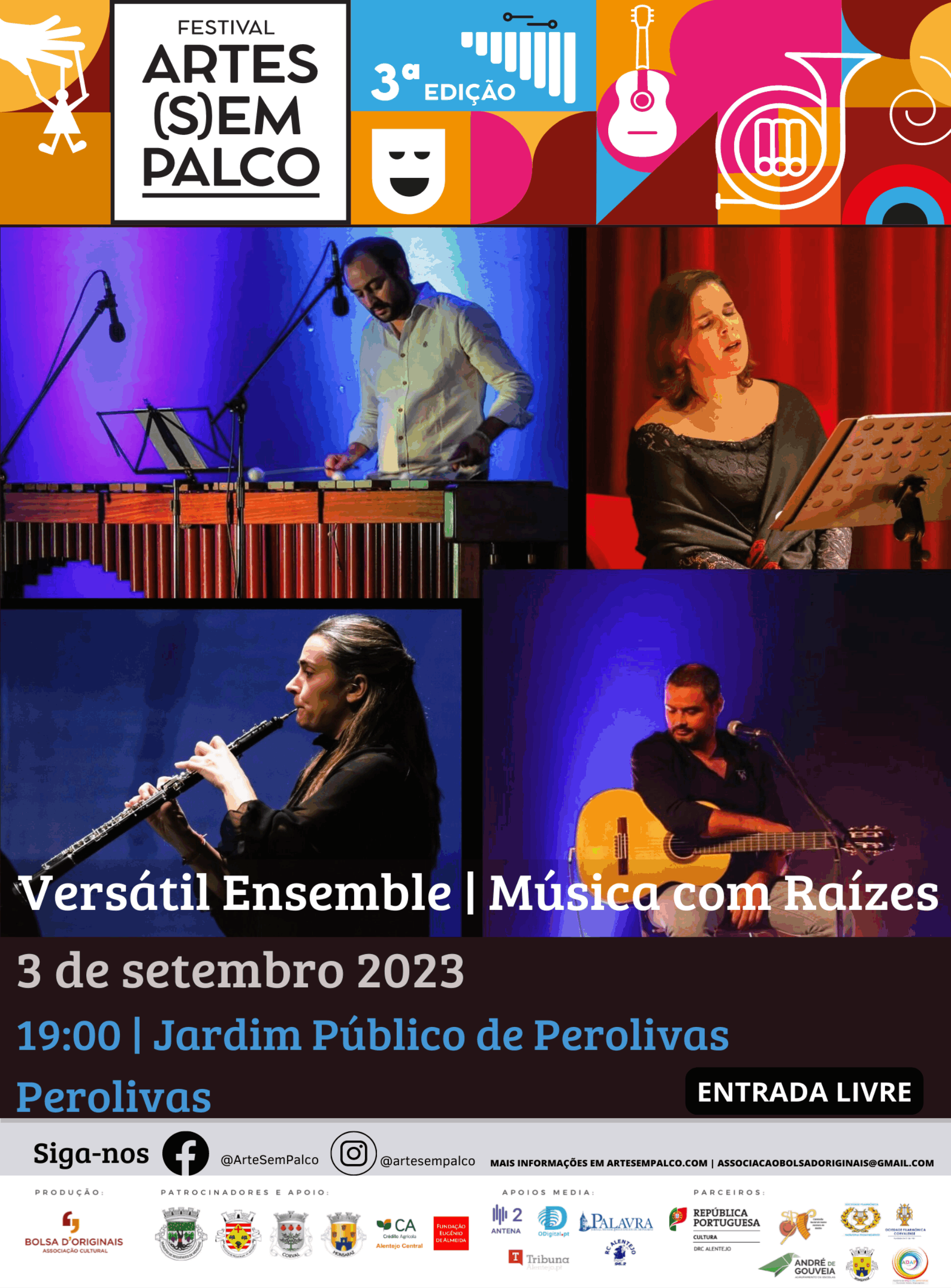 O Festival Arte(s)em Palco vai apresentar o espetáculo “Música com Raízes” com Versátil Ensemble: Voz, Viola Campaniça, Percussão e Oboé no dia 3 de setembro, pelas 19h00, no Jardim Público de Perolivas