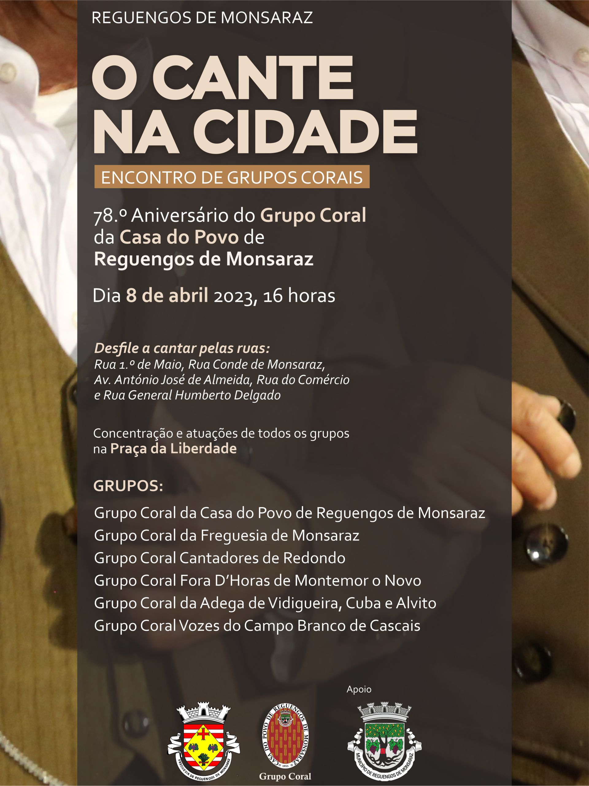 Haverá um desfile a cantar pelas ruas Rua 1.º de Maio, Rua Conde de Monsaraz, Av. António José de Almeida, Rua do Comércio e Rua General Humberto Delgado seguido da concentração e atuações de todos os grupos na Praça da Liberdade.