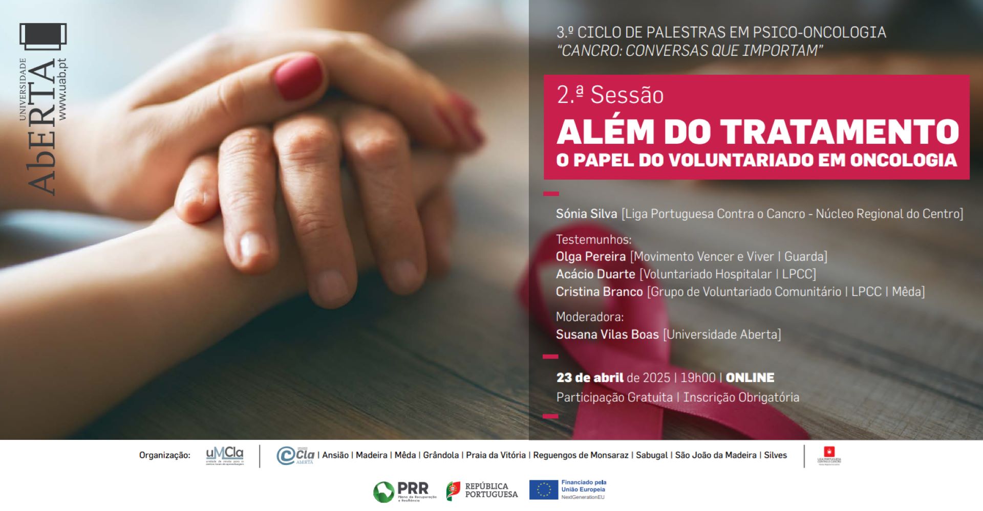 A sessão tem os contributos de Sónia Silva, da Liga Portuguesa Contra o Cancro – Núcleo Regional do Centro e os testemunhos de Olga Pereira, do Movimento Vencer e Viver – Guarda, Acácio Duarte, do Voluntariado Hospitalar – LPCC, e Cristina Branco, do Grupo de Voluntariado Comunitário – LPCC – Mêda. Susana Vilas Boas, docente na Universidade Aberta (UAb), é a moderadora.
