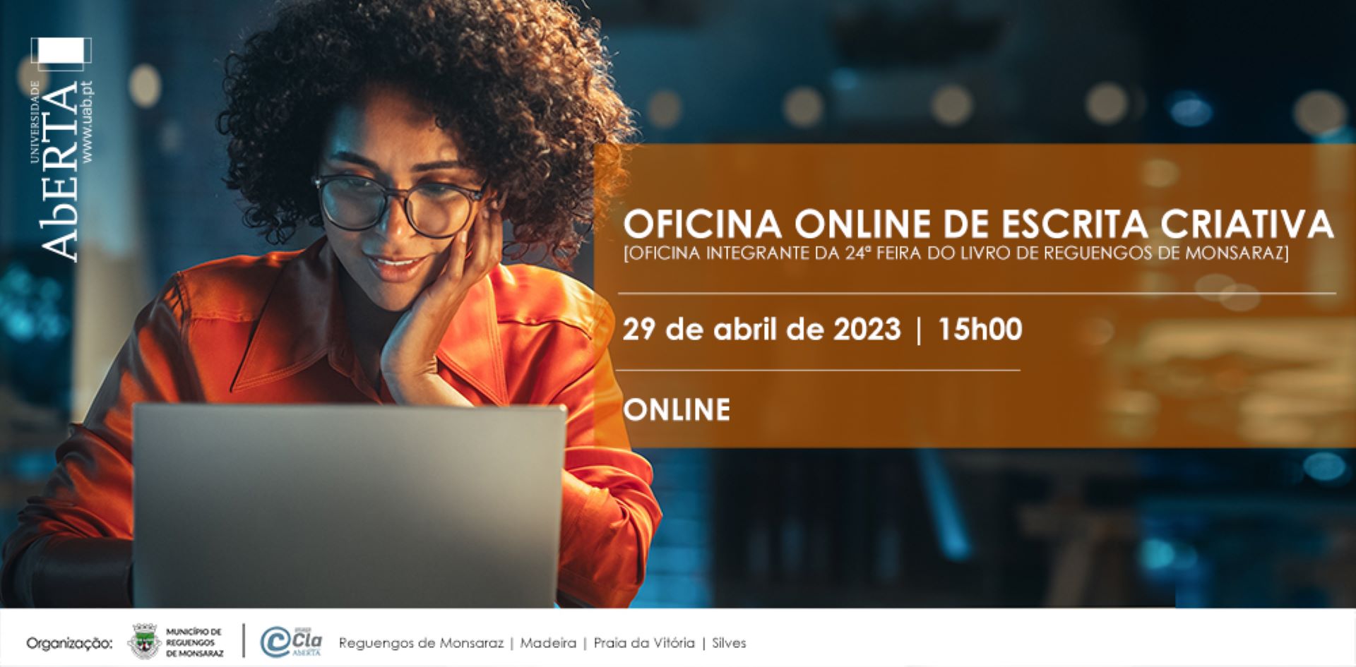 Integrada na 24ª Feira do Livro de Reguengos de Monsaraz, acontece no dia 29 de abril de 2023, às 15h00, uma Oficina Online de Escrita Criativa. A mesma tem enfoque no “free writing“, um tipo de escrita que ajuda a desbloquear ideias e que desenvolve a fluidez da prática de escrita, e a oficina ainda contemplará pequenos exercícios criativos.