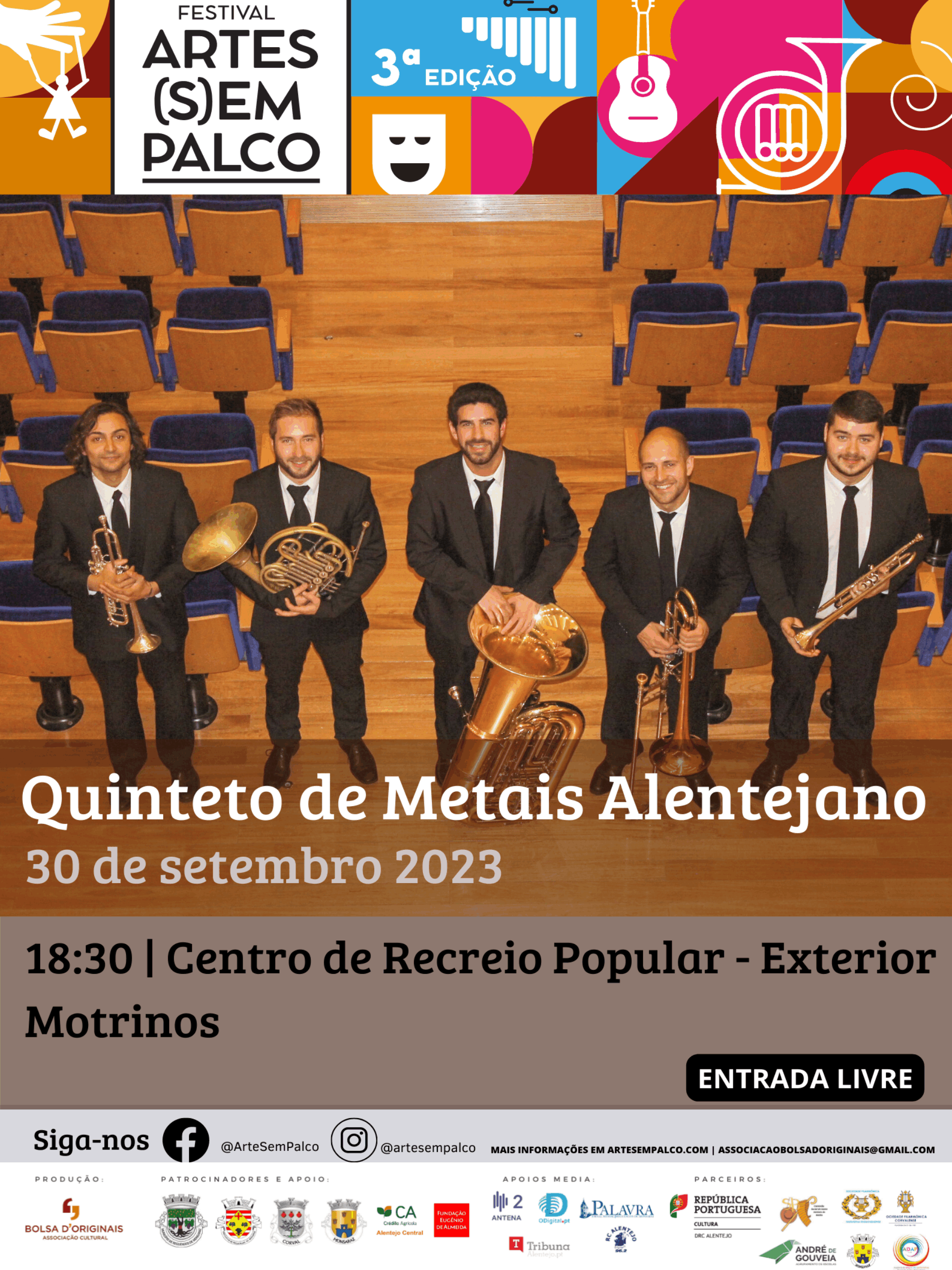 O Festival Arte(s)em Palco vai apresentar o Quinteto de Metais Alentejano no dia 30 de setembro, pelas 18h30, no palco exterior do Centro de Recreio Popular de Motrinos.