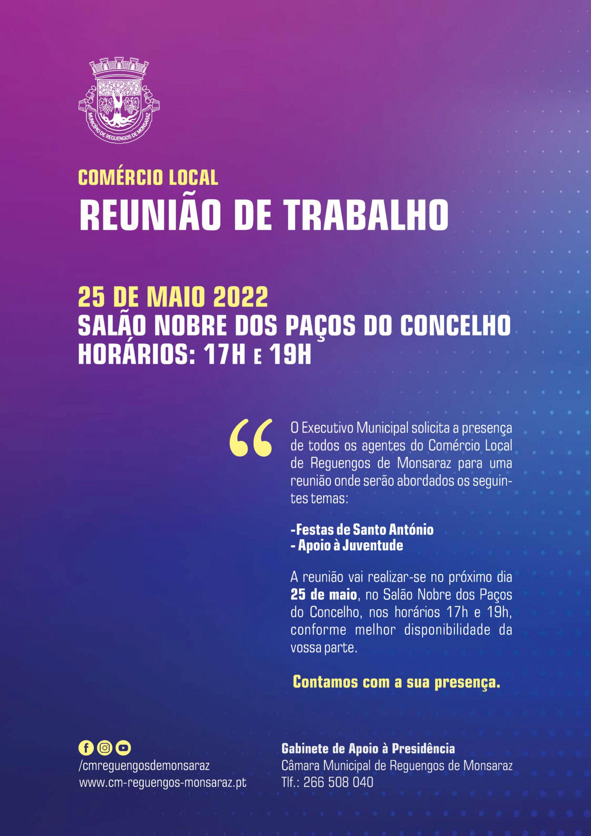 O Executivo Municipal solicita a presença de todos os agentes do comércio local de Reguengos de Monsaraz para uma reunião onde serão abordados os seguintes temas: