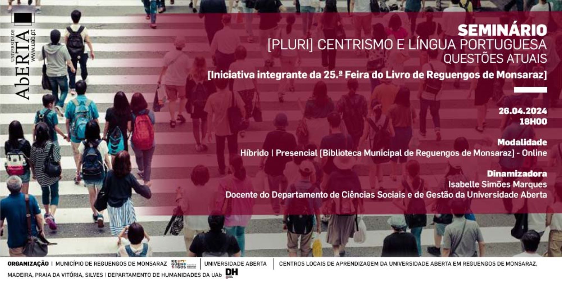 Integrado na 25.ª Feira do Livro de Reguengos de Monsaraz, acontece no dia 26 de abril de 2024, às 18h00, o Seminário em formato híbrido ”(Pluri) Centrismo e Língua Portuguesa: Questões Atuais”. No presencial a sessão decorre na Biblioteca Municipal de Reguengos de Monsaraz, a nível online a iniciativa decorrerá em plataforma colibri.