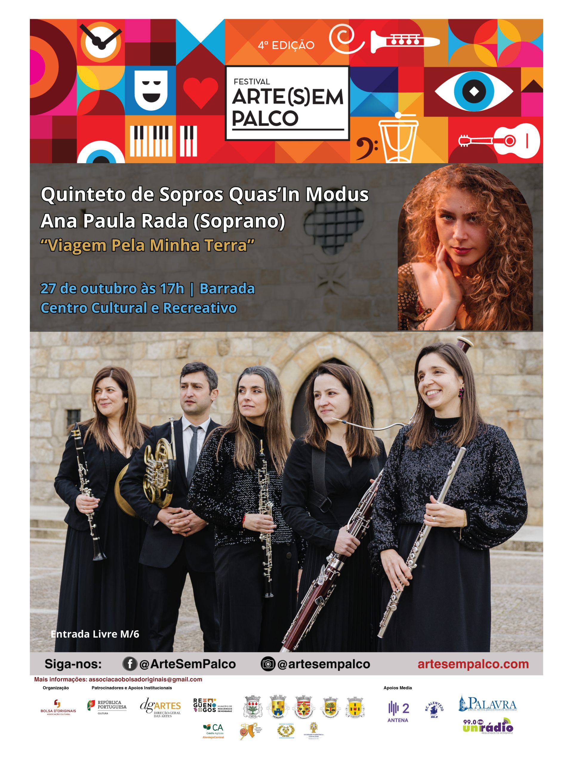 No dia 27 de outubro pelas 17h00 no Centro Cultural e Recreativo da Barrada, o Festival Arte(s)em Palco apresenta o concerto comentado “Viagem Pela Minha Terra”, interpretado pelo quinteto de sopros Quas’In Modus e pela soprano Ana Paula Rada.