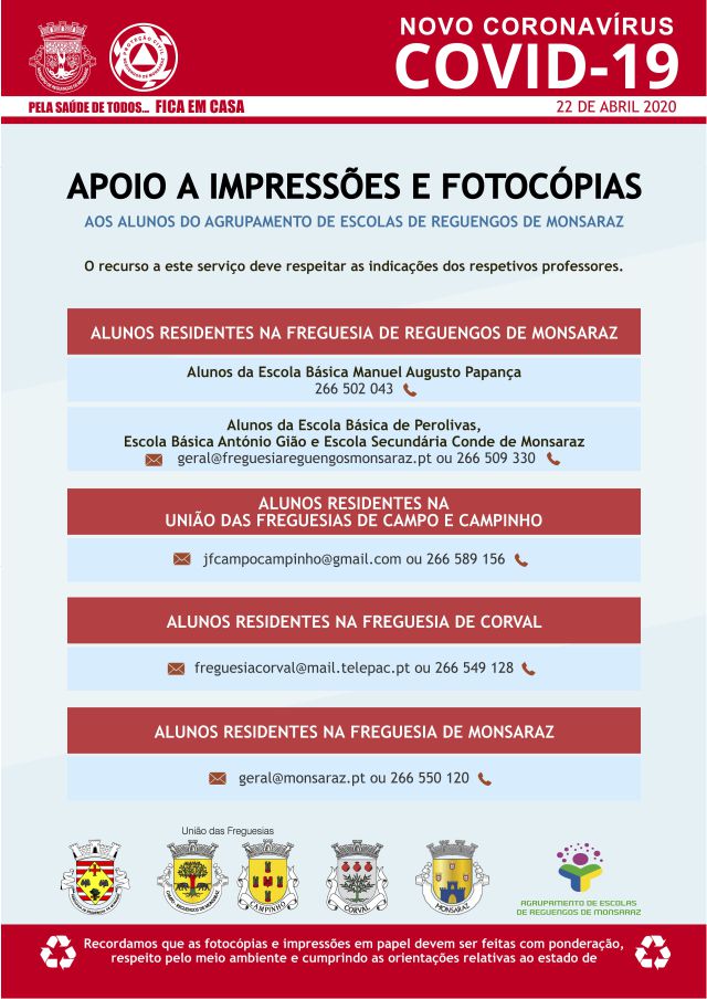 Os alunos do Agrupamento de Escolas de Reguengos de Monsaraz já podem fotocopiar e imprimir em papel gratuitamente os seus trabalhos escolares nas juntas de freguesia do concelho. O recurso a este serviço será feito por indicação dos professores, com ponderação, respeito pelo ambiente e pelas orientações relativas ao estado de emergência.